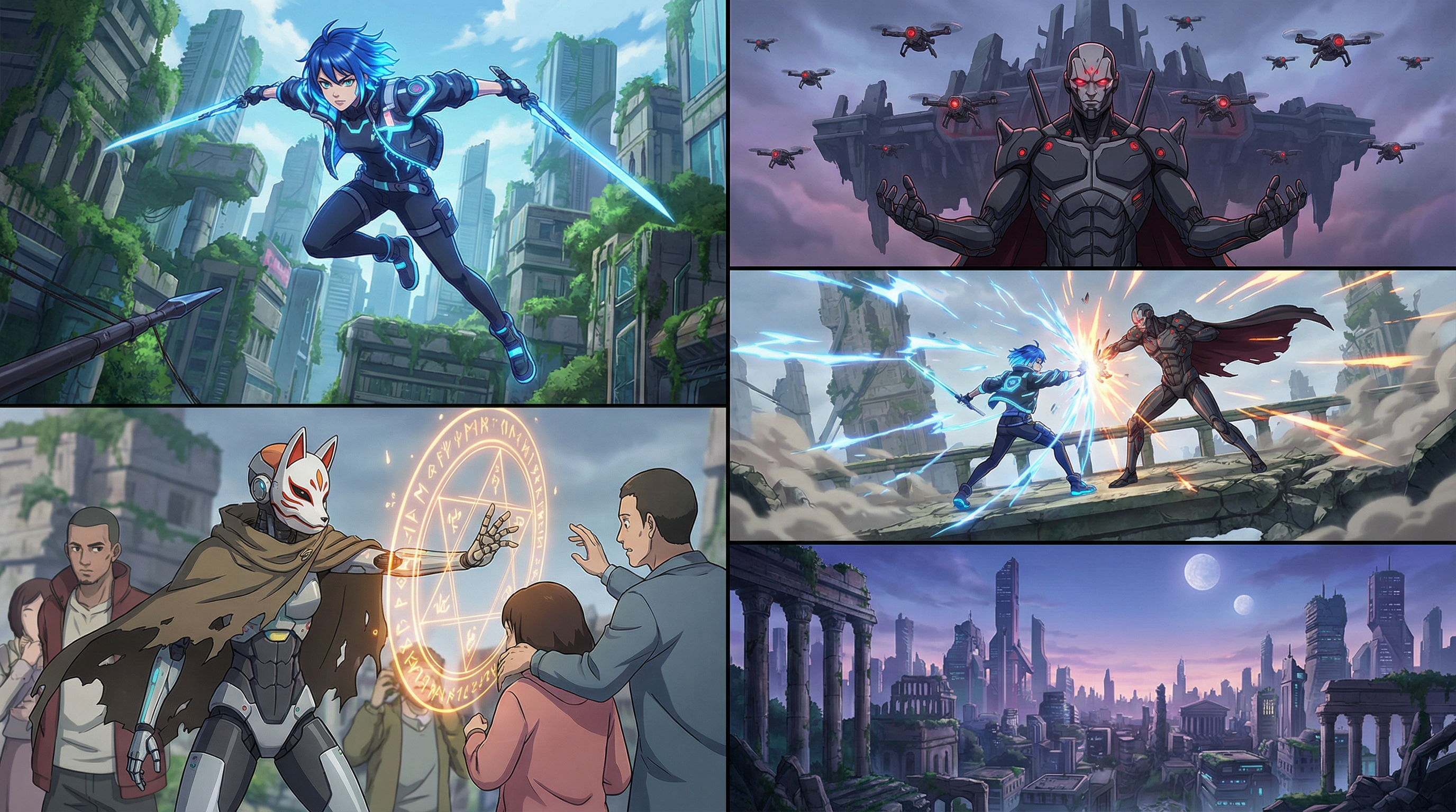 Generación fotorealista con consistencia temporal. Personajes estables escena tras escena.